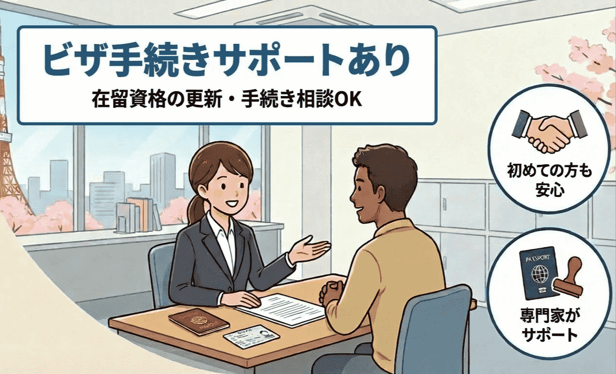 在留資格(特定技能)の更新や手続きについて相談できます。 日本で働くのが初めての人も安心です。