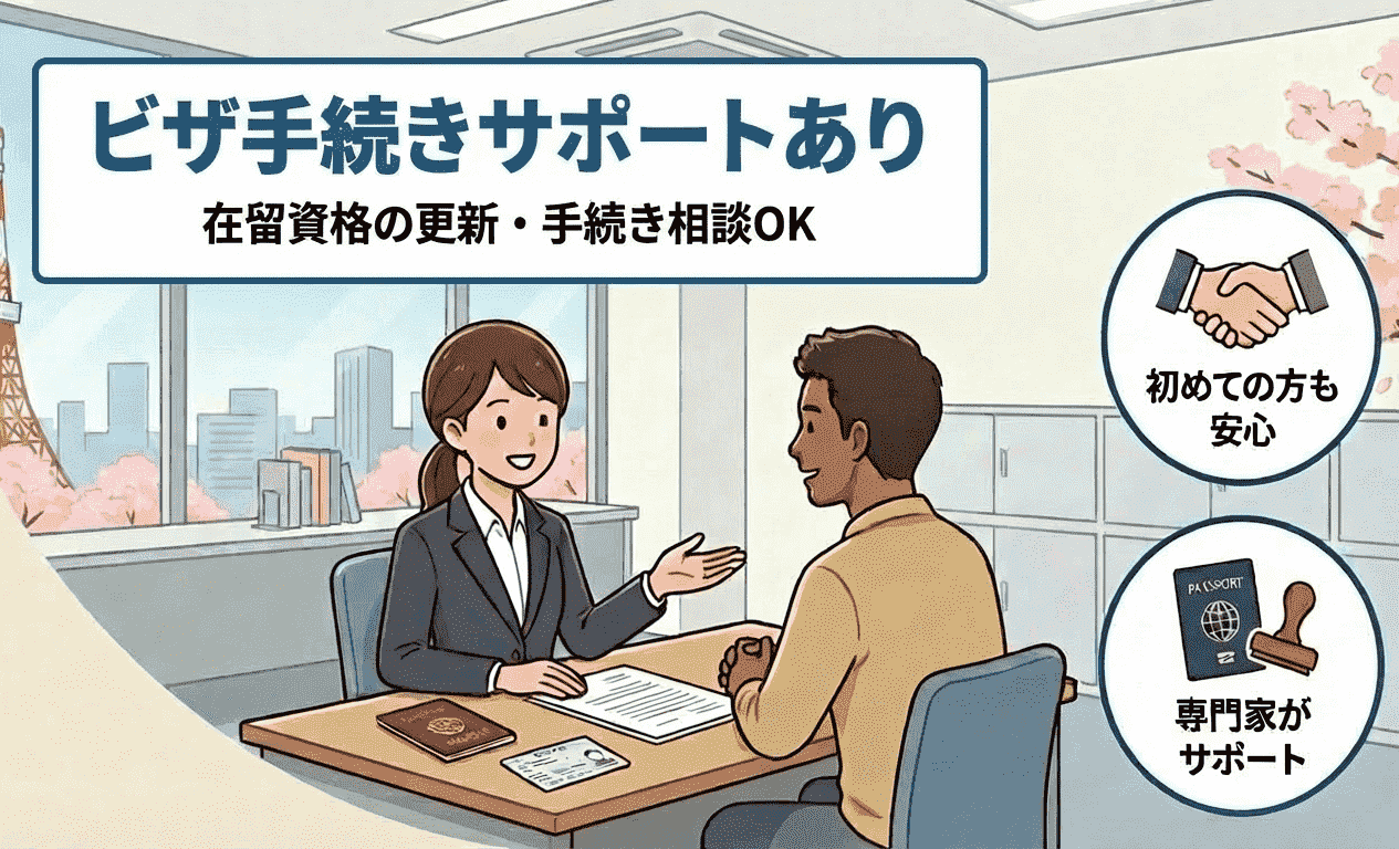 ・社会保険あり(健康保険・厚生年金・雇用保険) ・労災保険あり ・交通費支給 ・残業代支給 ・シフト相談OK ・有給休暇あり ・制服貸与 ・まかない(食事)あり ・ビザ(在留資格)手続きサポートあり ・仕事・生活の相談OK